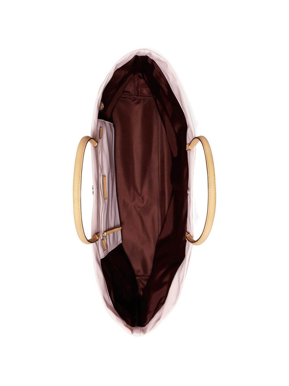 light pink top handle logo appliqué internal slip pocket Ella twist nylon tote