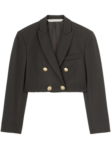 سترة قصيرة مزدوجة الصدر من بالم أنجلز، مصنوعة من مزيج صوف بكر أسود، وياقة مدببة، وجيب على الصدر، وأزرار ذهبية منقوشة، وحاشية قصيرة ومستقيمة. المقاس والمقاس المناسب - هذه القطعة مطابقة للمقاس الأصلي. نوصي باختيار مقاسك المعتاد. طول العارضة 1.75 متر/5 أقدام و8 بوصات، وترتدي مقاس 40 (إيطاليا).