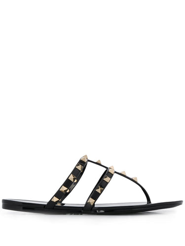 صندل روكستد صيفي بحزام مفتوح من الأمام ومزين بأحجار ذهبية سوداء، تصميم بحزامين، نعل داخلي يحمل العلامة التجارية، نعل مطاطي مسطح، تصميم سهل الارتداء
