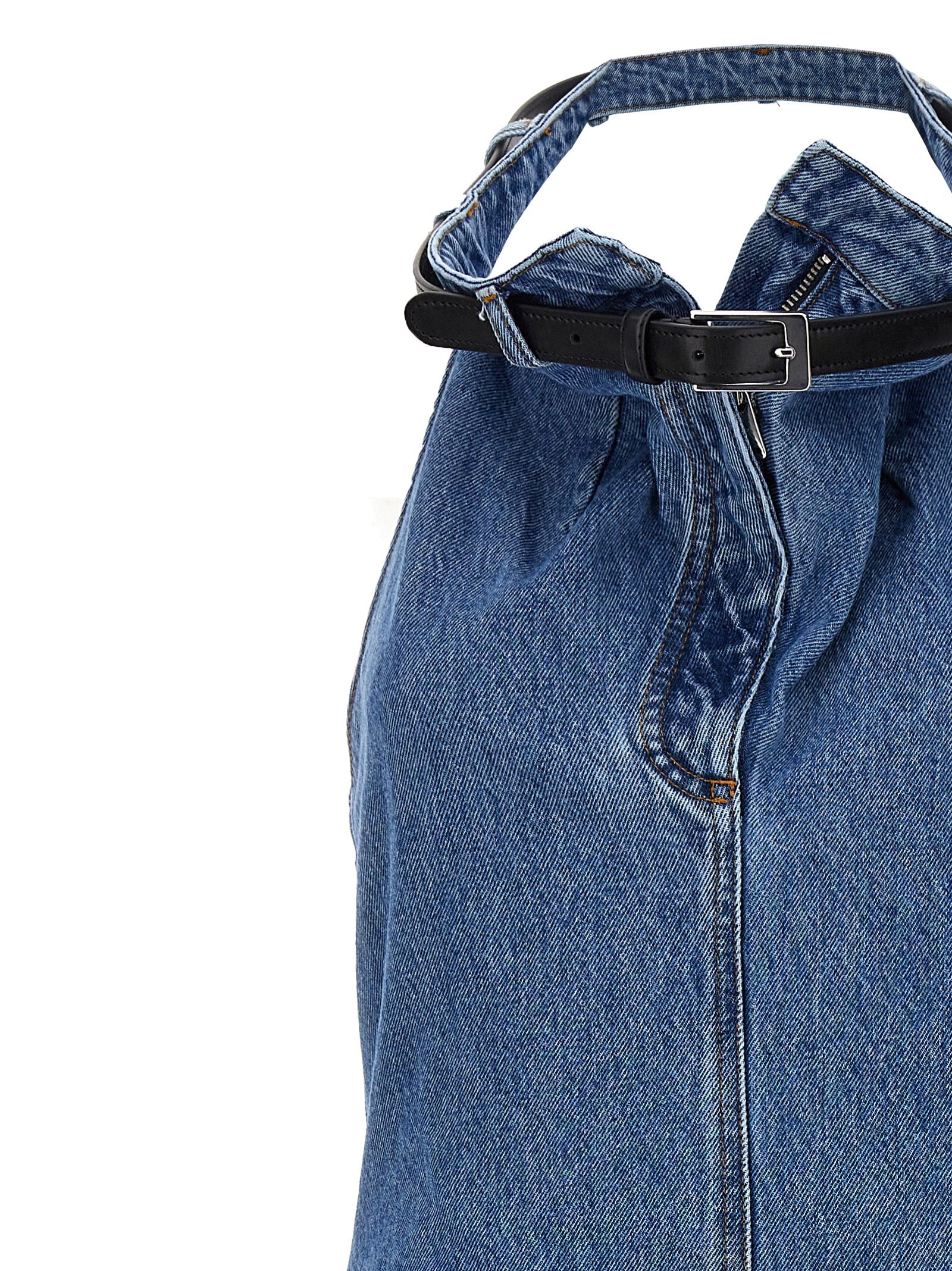 'Belt Halter Neck' sleeveless dress in cotton denim with leather belt around the neck, V-neck with zip detail. Size and Fit - true to size fit
