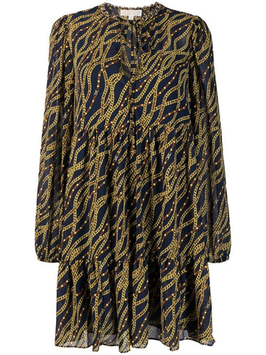 فستان بطبعة سلسلة من مايكل كورس، يتميز بلون أزرق داكن، ومزيج من البوليستر المعاد تدويره، وطبعة سلسلة، وياقة مكشكشة، وياقة على شكل حرف V، وربطة ذاتية الإغلاق، وأساور مطاطية، وأكمام طويلة، وتنورة واسعة، وطول يصل إلى فوق الركبة. انتبه: هذا المنتج مصنوع من 50% على الأقل من مواد معاد تدويرها أو مُعاد تدويرها. بالنسبة لمنتجات الملابس المصنوعة من مواد صناعية مُعاد تدويرها، نوصي بشدة باستخدام كيس غسيل خاص بالألياف الدقيقة لضمان عدم انبعاث أي مواد بلاستيكية دقيقة قد تُلوث المياه أثناء عملية التصنيع. فستان ميدي مطبوع. المقاس والمقاس - هذه القطعة مطابقة لمقاسك. نوصي باختيار مقاسك المعتاد. طول العارضة 1.75 متر / 5 أقدام و8 بوصات، وترتدي مقاس S.