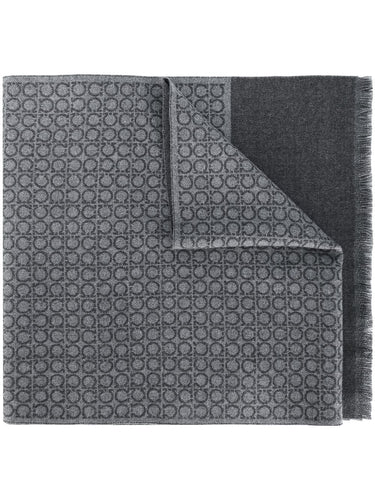 ash grey wool Gancini print contrasting panel detail fringed edge rectangle shape wraparound style Gancini wool scarf Size and Fit - WIDTH: 34.0 Centimetres. LENGTH: 180.0 Centimetres.