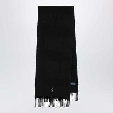 Polo Ralph Lauren black wool scarf featuring fringed edges and Pony logo embroidery.