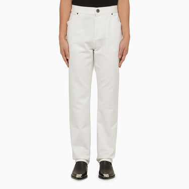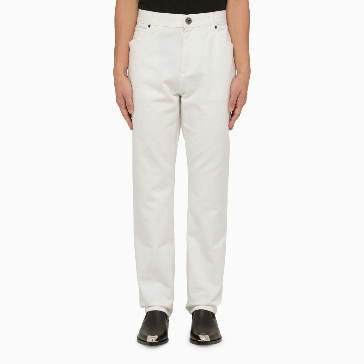 White cotton regular trousers from Balmain featuring a front zip and button fastening, waist loops, five classic pockets, embroidery on back pocket and a regular fit. Size and Fit - Model wears size 32 Model measurements: Height: 187 cm Chest: 95 cm Waist: 73 cm Hips: 99 cm