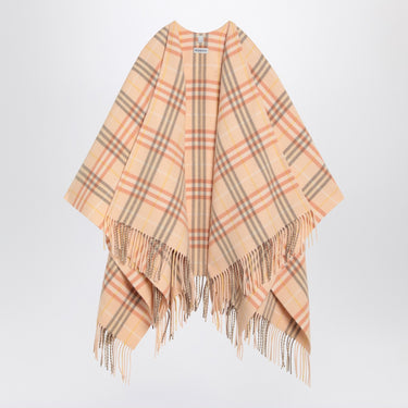 Light pink wool and cashmere Burberry cape with all-over Check pattern and decorative fringes at the ends.