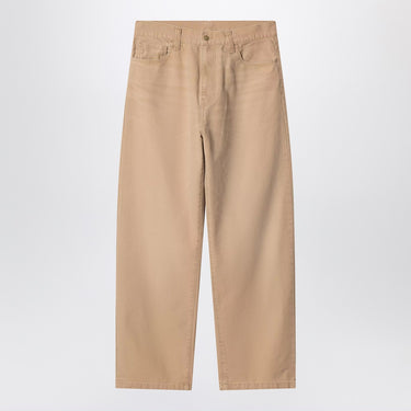 Carhartt WIP pants in heavy Dearborn cotton canvas in Dusty Brown colour, featuring five pockets, a loose fit, tapered leg, regular waist, back pocket with a square synthetic leather label, bar tacks at high-wear areas, and a zip and button closure. Size and Fit - Model wears size 33 Model measurements: Height: 185 cm Chest: 105 cm Waist: 85 cm Hips: 100 cm