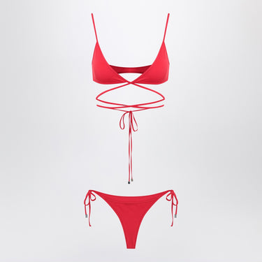 Two-piece bikini by The Attico in red stretch fabric, featuring a bra with long ties to be knotted around the bust, contrasting logo on the back, and a giftable panty with side ties with metal tips. Size and Fit - Model wears size S Model measurements: Height: 179 cm Chest: 82 cm Waist: 65 cm Hips: 90 cm