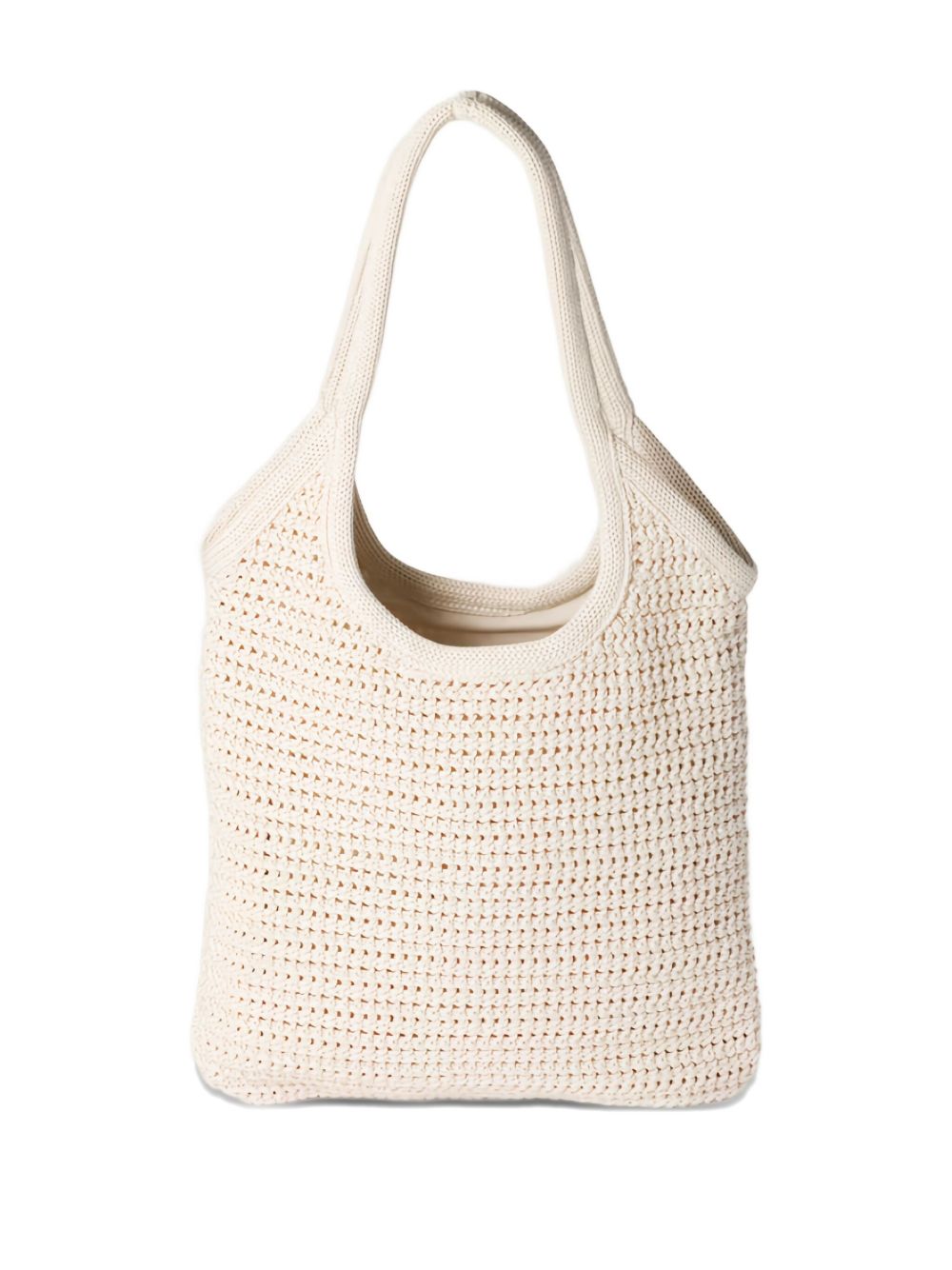 This Ivy crochet bag is crafted in a refined black-and-white knit texture, featuring a soft gesso hue. Designed with a top handle and enhanced by a signature knit logo, it combines artisanal craftsmanship with modern elegance. The open-top design adds convenience, making it a standout piece for Autumn/Winter 2025.