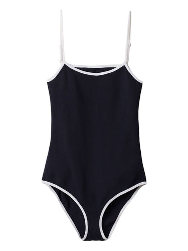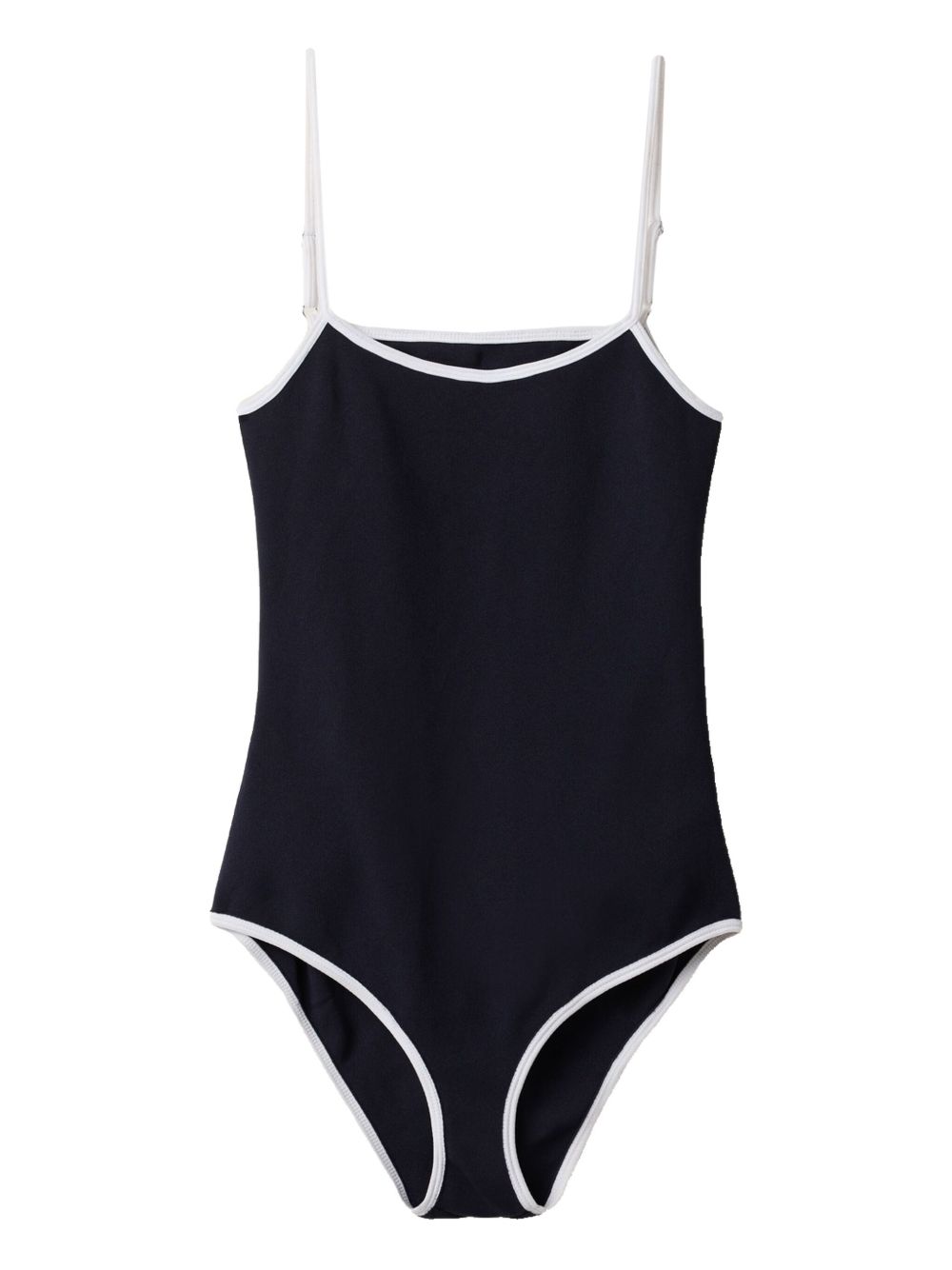 Navy one-piece swimsuit with a clean square neckline and adjustable shoulder straps. Crafted in a smooth stretch blend (96% polyamide, 4% elastane) for a flattering, comfortable fit—ideal for SS25 – Spring/Summer 2025.