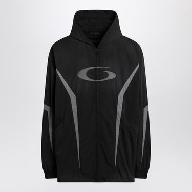 Lightweight Balenciaga jacket in black and gray stretch polyester, featuring a hood with drawstring, front zip closure, side pockets, elasticized cuffs, and Loop Sports embroidery on the front and back. Size and Fit - Model wears size M Model measurements: Height: 185 cm Chest: 100 cm Waist: 83 cm Hips: 92 cm