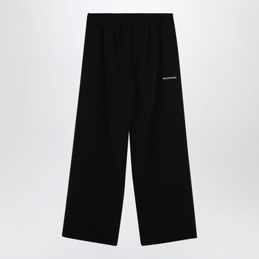 Balenciaga pants in black polyester, characterized by a baggy/loose fit, elasticized waist, side welt pockets, and front logo print.