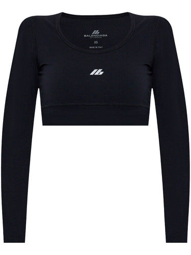 black stretch-design reflective logo print to the front U-neck long sleeves straight hem Logo cropped top
