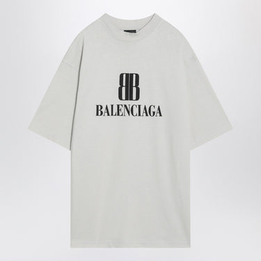 Balenciaga T-shirt in vintage white jersey, featuring a ribbed crew neck, short sleeves, a small BB logo printed on the front, and a medium fit. Size and Fit - Model wears size M Model measurements: Height: 187 cm Chest: 102 cm Waist: 76 cm Hips: 92 cm