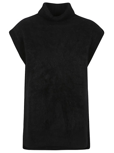 Black turtleneck sweater, without stains, straight cut and straight base. Cashmere high-neck vest Size and Fit - This piece fits true to size. We recommend you get your regular size. Model is 1,75m / 5ft 8in wearing size 36 (FR)