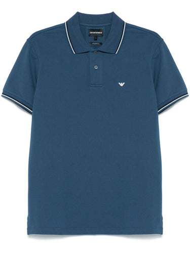 imperial blue short front button fastening short side slits ribbed cuffs stripe trim Logo cotton polo shirt Size and Fit - This piece fits true to size. We recommend you get your regular size. Model is 1,84m / 6ft 1in wearing size M