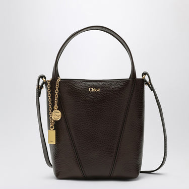 Small Chloé tote bag in dark brown grained leather, featuring two leather handles with gold-finish metal ring, magnetic closure, adjustable and removable shoulder strap, chain charm and front logo print. Size and Fit - Width 18 cm x Height 19 cm x Depth 8 cm Adjustable shoulder strap length min 120 cm - max 130 cm Handle drop: 13 cm