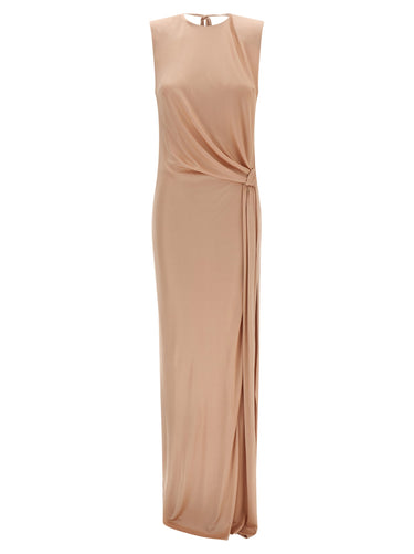 Long 'Red Carpet' dress in shiny viscose jersey, draped on one side, crew neck, sleeveless with padded shoulders and metal crescent detail, wide back V-neck with ribbon, wide side split, knit lining. Size and Fit - Slim fit