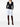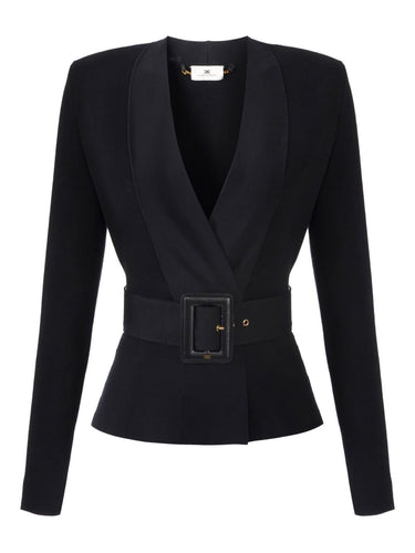 black v-neck fitted waist wide belt rectangular buckle long sleeves Belted v-necked top