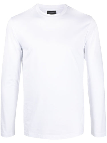 Long-sleeve T-shirt from EMPORIO ARMANI featuring optical white, logo print at the hem, round neck, long sleeves and straight hem. This item contains at least 50% materials which are certified or widely recognised as having a lower environmental impact through production and/or manufacturing processes that reduce water consumption and the use of harmful chemicals, or re-use by-products of the production process.. Learn more about what makes a product Conscious on our Conscious Criteria page. Logo t-shirt Size and Fit - This piece fits true to size. We recommend you get your regular size. Model is 1,84m / 6ft 1in wearing size M