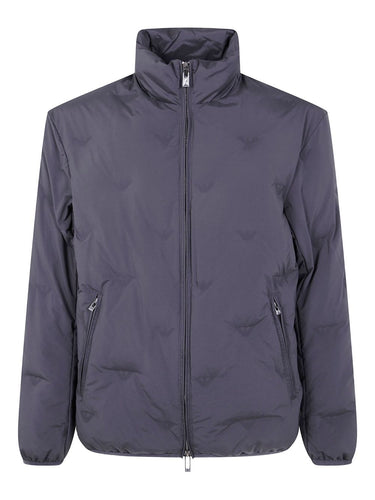 dark grey quilted design eagle logo pattern high neck zip fastening side pockets Nylon short down jacket