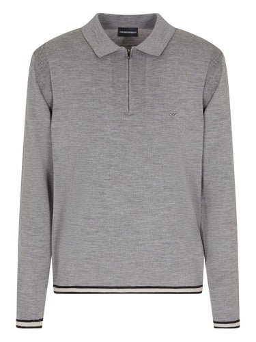 ash grey short front zip fastening polo collar long sleeves Wool polo shirt