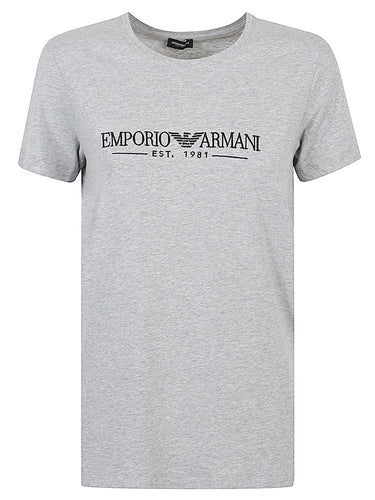 Gray t-shirt, short sleeves, crew neck, EMPORIO ARMANI logo, straight hem. Logo cotton t-shirt Size and Fit - This piece fits true to size. We recommend you get your regular size. Model is 1,75m / 5ft 8in wearing size S