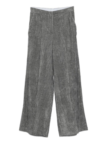 grey, pinstripe pattern, rear elasticated waistband, side pockets. Wide leg trousers