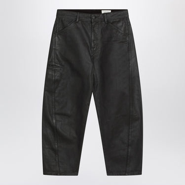 Lemaire chocolate brown shiny cotton denim pants, featuring a front zip and button closure, belt loops, two welt pockets, two patch pockets on the back, and a side welt pocket. Size and Fit - Model wears size 48 IT Model measurements: Height: 187 cm Chest: 100 cm Waist: 79 cm Hips: 96 cm