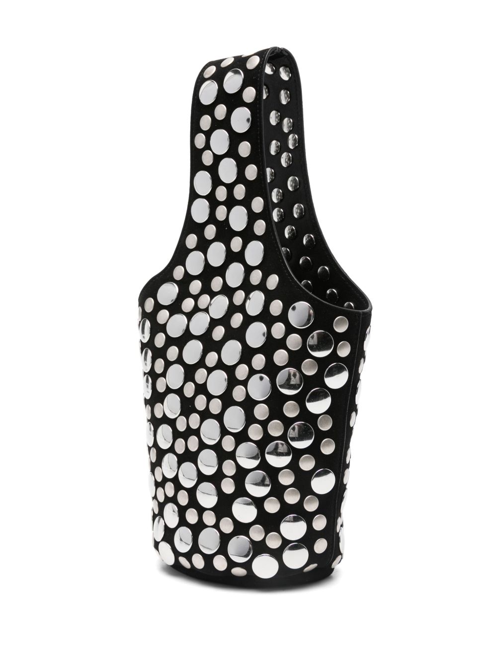 A statement mini with refined edge, the Livia small bag is crafted from 100% black calf leather and finished with silver-tone stud embellishments. The structured silhouette features a flat top handle and an open-top design for quick access to essentials. Compact yet impactful, it transitions effortlessly from daytime polish to evening allure.