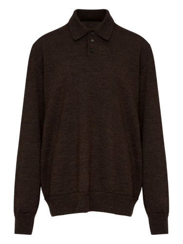 coffee brown short front button fastening ribbed cuffs and hem signature four-stitch logo long sleeves Wool polo shirt