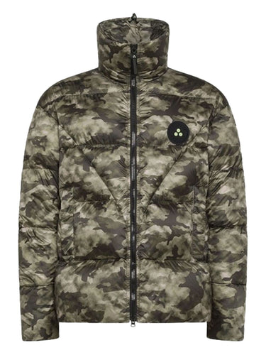 green camouflage pattern high neck front zip fastening long sleeves logo-patch at the heel side slit pockets Takeoff camou down jacket