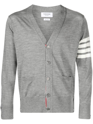 grey/white virgin wool knitted construction signature 4-Bar stripe signature grosgrain loop tab V-neck front button fastening long sleeves buttoned cuffs 4Bar wool cardigan
