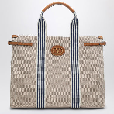 Large tote bag by Valentino Garavani in natural-coloured canvas, featuring two striped fabric handles and leather handles, adjustable and removable shoulder strap, side buckles and leather patch with gold-tone metal VLogo Signature plaque, magnetic closure and an internal flat zipped pocket. Size and Fit - Width 35 cm x Height 29 cm x Depth 18 cm Adjustable shoulder strap length min 80 cm - max 100 cm Handle drop 16 cm