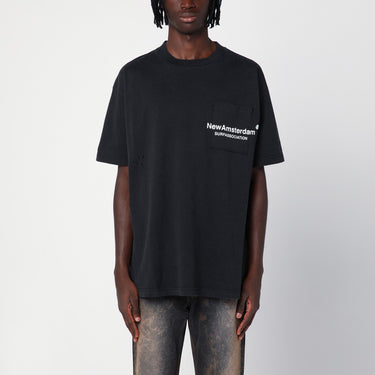 Black cotton New Amsterdam Surf Association T-shirt, featuring wide short sleeves, contrasting lettering logo print on the front, a patch pocket on the chest, ribbed crew neck, localised wear and over fit. Size and Fit - Model wears size L Model measurements: Height: 187 cm Chest: 102 cm Waist: 76 cm Hips: 92 cm