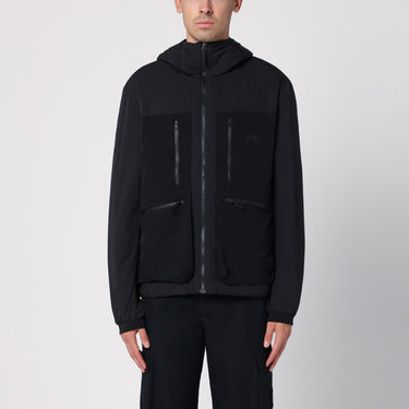Hooded jacket made of black technical nylon by Purple Mountain Observatory, featuring a front zip fastening, long sleeves with elasticated cuffs, a high collar, four zipped pockets on the front and a tone-on-tone printed logo on the chest. Size and Fit - Model wears size L Model measurements: Height: 185 cm Chest: 100 cm Waist: 83 cm Hips: 92 cm