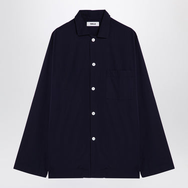 Navy blue organic cotton pyjama shirt from Tekla featuring long sleeves, front buttoning, classic collar, lettering logo tag on the side and straight hem. Size and Fit - Model wears size L Model measurements: Height: 187 cm Chest: 102 cm Waist: 76 cm Hips: 92 cm