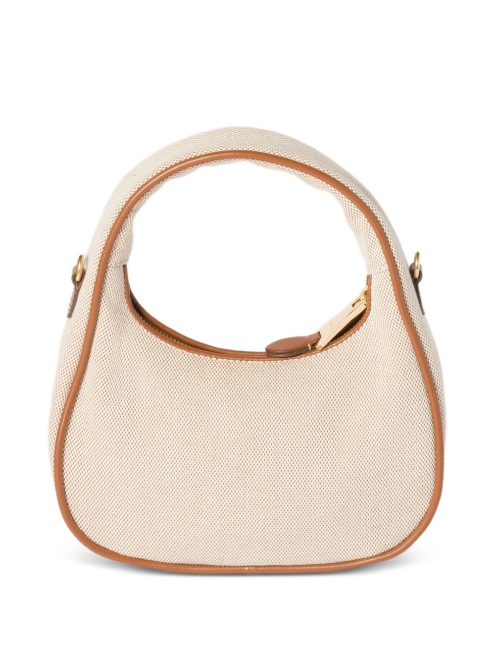 A compact hobo handbag crafted in canvas with leather trim, finished in a rich cuoio tone for versatile everyday styling. The curved silhouette sits comfortably under the arm while the carryover design keeps it seasonless and refined, offering an easy, polished companion for daily essentials.