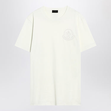 White cotton T-shirt by Moncler, featuring a crew neck design, three-dimensional logo on the chest, logo patch on the back, short sleeves, and straight hem.