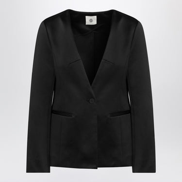 The Garment jacket in black mixed cotton and recycled fabric, featuring a V-neck, long sleeves, a back detail with a slit, a front button closure, and two side welt pockets. Size and Fit - Model wears size 8 UK Model measurements: Height: 180 cm Chest: 85 cm Waist: 66 cm Hips: 89 cm