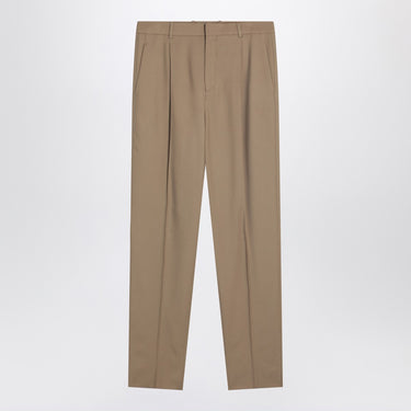Beige wool Saint Laurent trousers, featuring a front zip closure with a hook, belt loops, two side welt pockets, welt pockets at the back with a button, and pleats at the front. Size and Fit - Model wears size 48 IT Model measurements: Height: 187 cm Chest: 102 cm Waist: 76 cm Hips: 92 cm