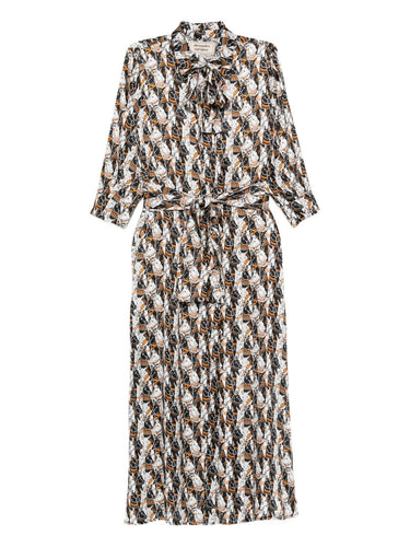 multicolour all-over graphic print tie neck self-tie belt three-quarter sleeves pleated skirt Printed shirtdress Size and Fit -  .