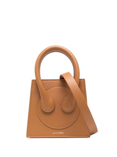 x Ester Manas small Cake tote bag from AZ FACTORY featuring logo stamp to the front, panelled design, two rolled top handles, adjustable detachable shoulder strap, main compartment, internal card slot, internal logo stamp, brown and calf leather. Leather mini crossbody bag Size and Fit - Width 4,72 in / 12 cm Height 4,72 in / 12 cm Depth 1,97 in / 5 cm Handle 2,76 in / 7 cm Strap 24,41 in / 62 cm