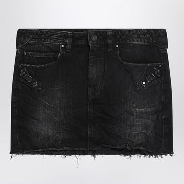Balenciaga mini skirt in black washed cotton denim, featuring buckle and stud details inspired by the Le City bag on side, front and back pockets, mid-rise waist, concealed button closure, belt loops, back logo patch, and raw-cut hem. Size and Fit - Model wears size 36 FR Model measurements: Height: 179 cm Chest: 82 cm Waist: 65 cm Hips: 90 cm