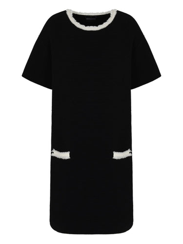 black ribbed texture short sleeves round neck frayed trim patch pockets Short dress