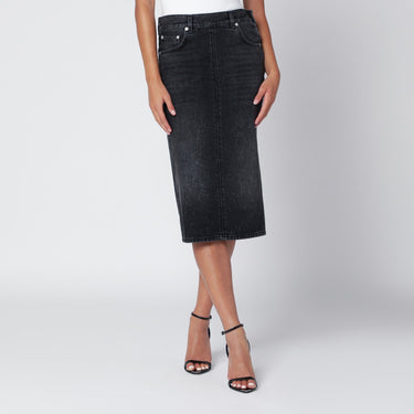 Haikure black washed-effect cotton denim skirt, featuring side zip and button closure, belt loops, five classic pockets, back slit, and back logo patch. Size and Fit - Model wears size 26 Model measurements: Height: 178 cm Chest: 89 cm Waist: 62 cm Hips: 88 cm