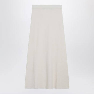 Max Mara long skirt in ivory stretch cashmere blend yarn, featuring a slightly flared silhouette, elasticated waist, ribbed hem and unlined design. Size and Fit - Model wears size S Model measurements: Height: 178 cm Chest: 83 cm Waist: 63 cm Hips: 91 cm