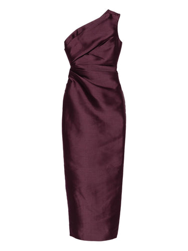 burgundy one-shoulder neckline draped bodice maxi length straight hemline Kira midi dress Size and Fit - This piece fits true to size. We recommend you get your regular size. Model is 1,75m / 5ft 8in wearing size 8 (UK)