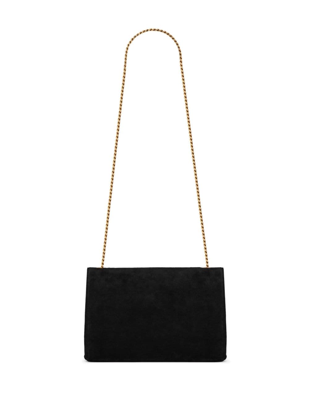 From the Spring Summer 2025 collection, this Yves Saint Laurent Kate medium bag is crafted in black calf leather with gold-tone hardware. Featuring a chain-link strap, fold-over top, rear pouch pocket, and a main interior compartment, it offers both elegance and practicality for day or evening wear.