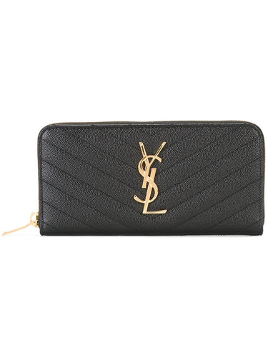 From the Spring Summer 2025 collection, this Yves Saint Laurent Monogram wallet is crafted in matelassé calf leather with a refined black finish. The design features a gold-tone logo plaque, zip-around closure, and an organized interior with card slots, compartments, and a central zip pocket. A sophisticated piece that balances luxury and everyday practicality.