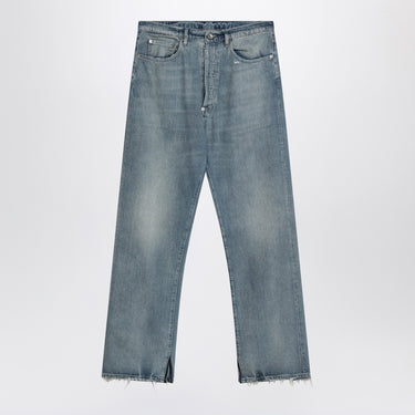 Maison Margiela jeans in blue cotton denim with a faded effect, characterized by a front zip closure and hook, belt loops, five classic pockets, raw hem with rips and slits on the side, and a back detail with a buckle. Size and Fit - Model wears size 32 Model measurements: Height: 185 cm Chest: 105 cm Waist: 85 cm Hips: 100 cm